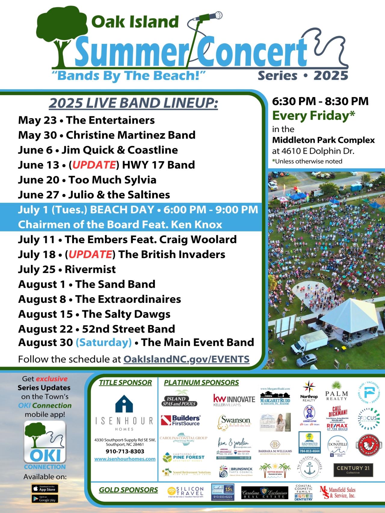 The sun is out, the fun is back, and the “Bands by the Beach” are once again ready to rock, groove, swing and swoon their way through the soundtrack of your perfect summer! For 16 weeks on Fridays from 6:30 pm to 8:30 pm at the Middleton Park Ampitheater, we turn the amps up to “11” and come together for the annual Town of Oak Island Summer Concert Series.